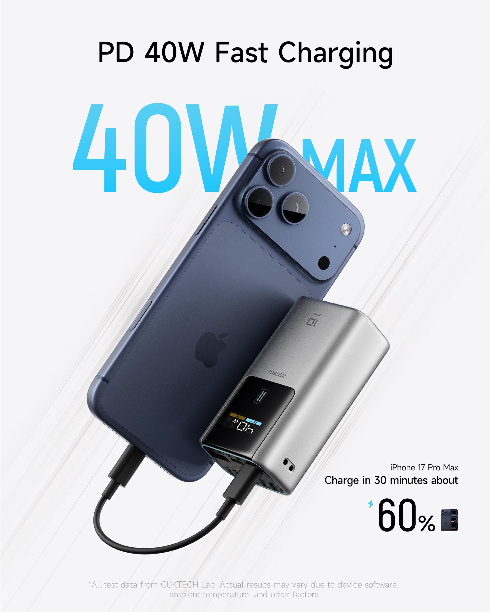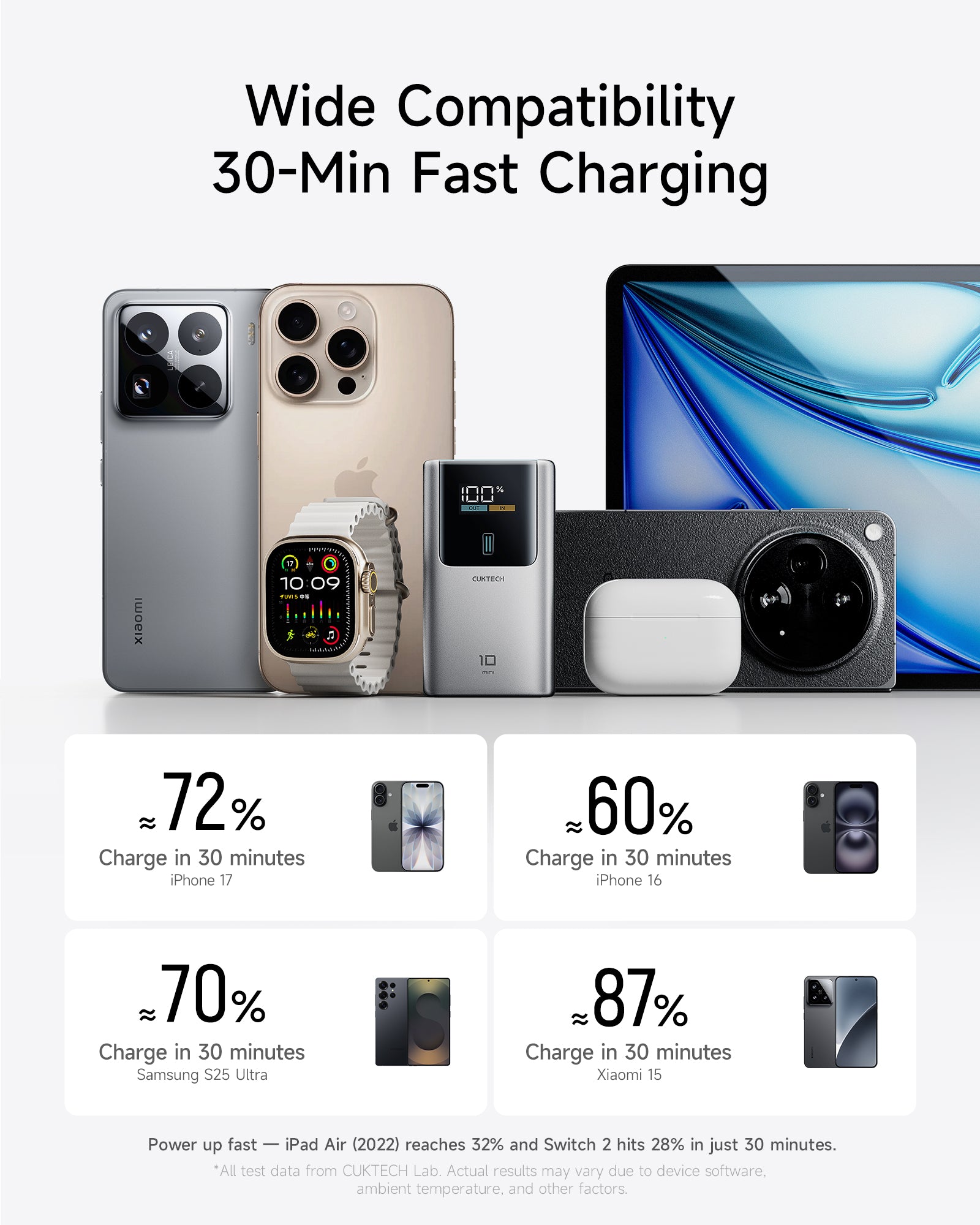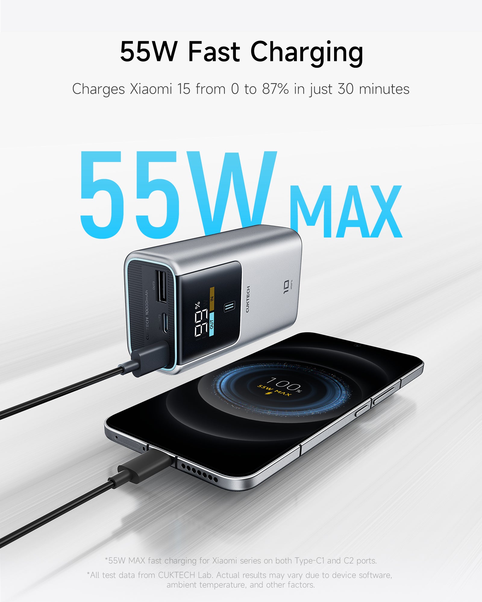 55W MAX-Fast Charging: Both USB-C ports support 55W MAX input/output.Charging iPhone 16 Pro Max up to 58%, Samsung S25 Ultra up to 70% and Xiaomi 15 up to 87% in 30 minutes.