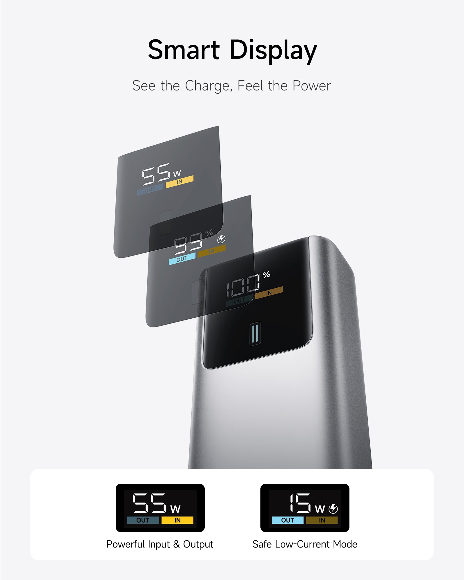 LED Digital Display – Real Fast Charging, you control: Provides real-time battery level, input and output power. Double-press the button to activate low-current mode—perfect for safely charging Bluetooth earphones, smartwatches and other small devices.