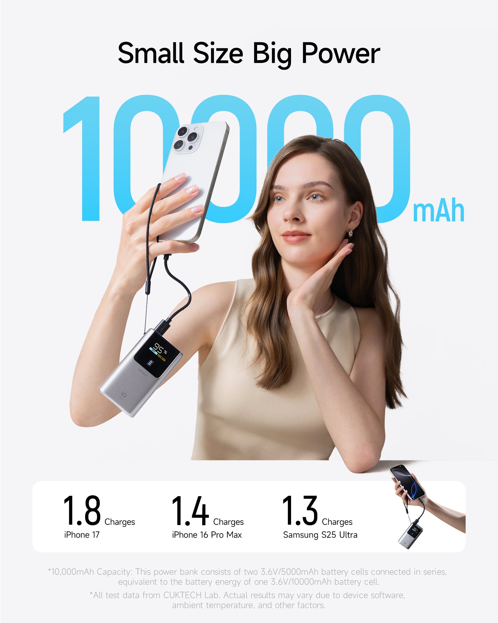 Broad Compatibility with Multi-Protocol Support: Compatible with a wide range of fast-charging protocols, including PD, PPS,UFCS, and SCP,this power bank is compatible with multiple devices across various brands, including Apple, Samsung, and Xiaomi. It intelligently adjusts the output power to ensure an efficient and safe charging experience.
